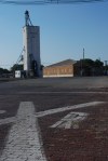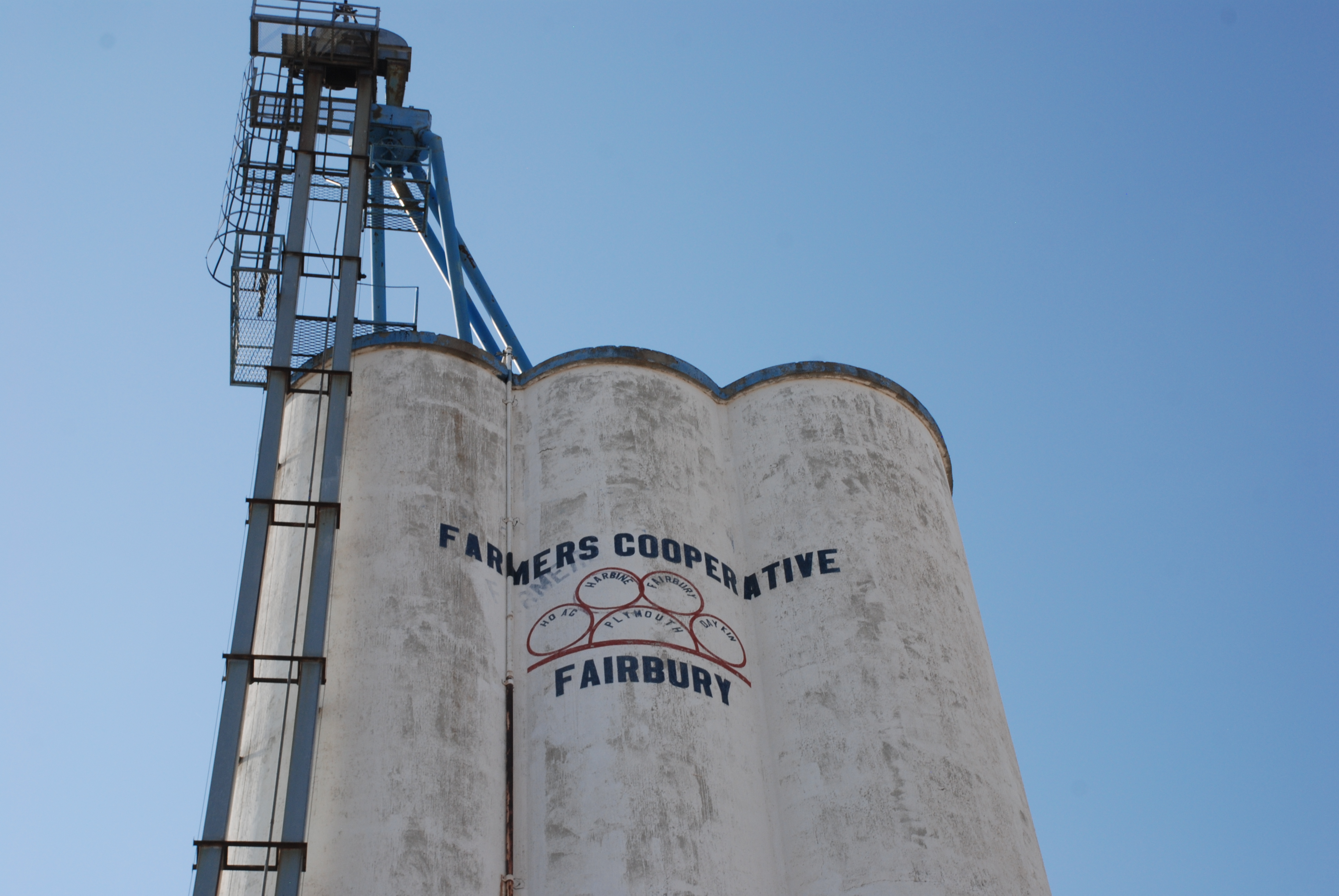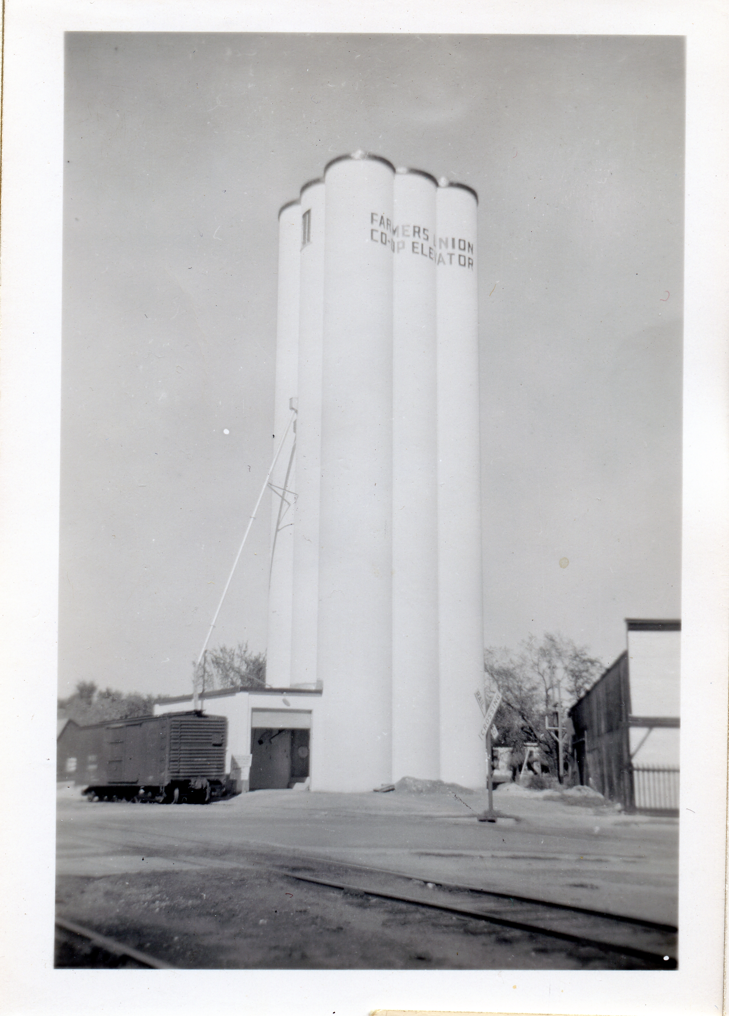 When I saw it, the Farmers Cooperative elevator did not give a clue to its builder from the outside. It warned intruders away emphatically with “No Trespassing” signs, and it sported a freshly painted logo, which seemed to indicate that it was still in use. But because it was deserted I had no one to ask. We knew from a newspaper article, marking the construction progress of the McCook, Neb. elevator in 1949, that my grandfather had previously built the Fairbury elevator. So when my husband and I went to see for ourselves, I took documentary photos. Later, Gary Rich compared them with Grandpa’s old photos and quickly made the identification, noting the relative position of the railroad tracks, and the loading chute extending beyond the drive way.