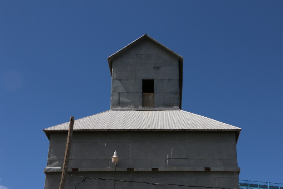 A closer view of the metal-clad wooden elevator. Note the modest eaves, which reduced the chance of catching sparks from a passing train.