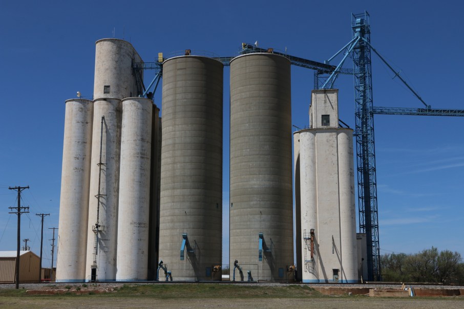 Tillotson Construction Co. grain elevators of reinforced concrete at Pond Creek, Oklahoma, on April 19, 2018.