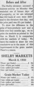 “The Shelby elevators assumed a business activity on Monday (July 10, 1933) that reminded one of former days of prosperity, as we are informed that 213 loads of corn were delivered to the elevators that day, and the price paid was 47c per bushel.