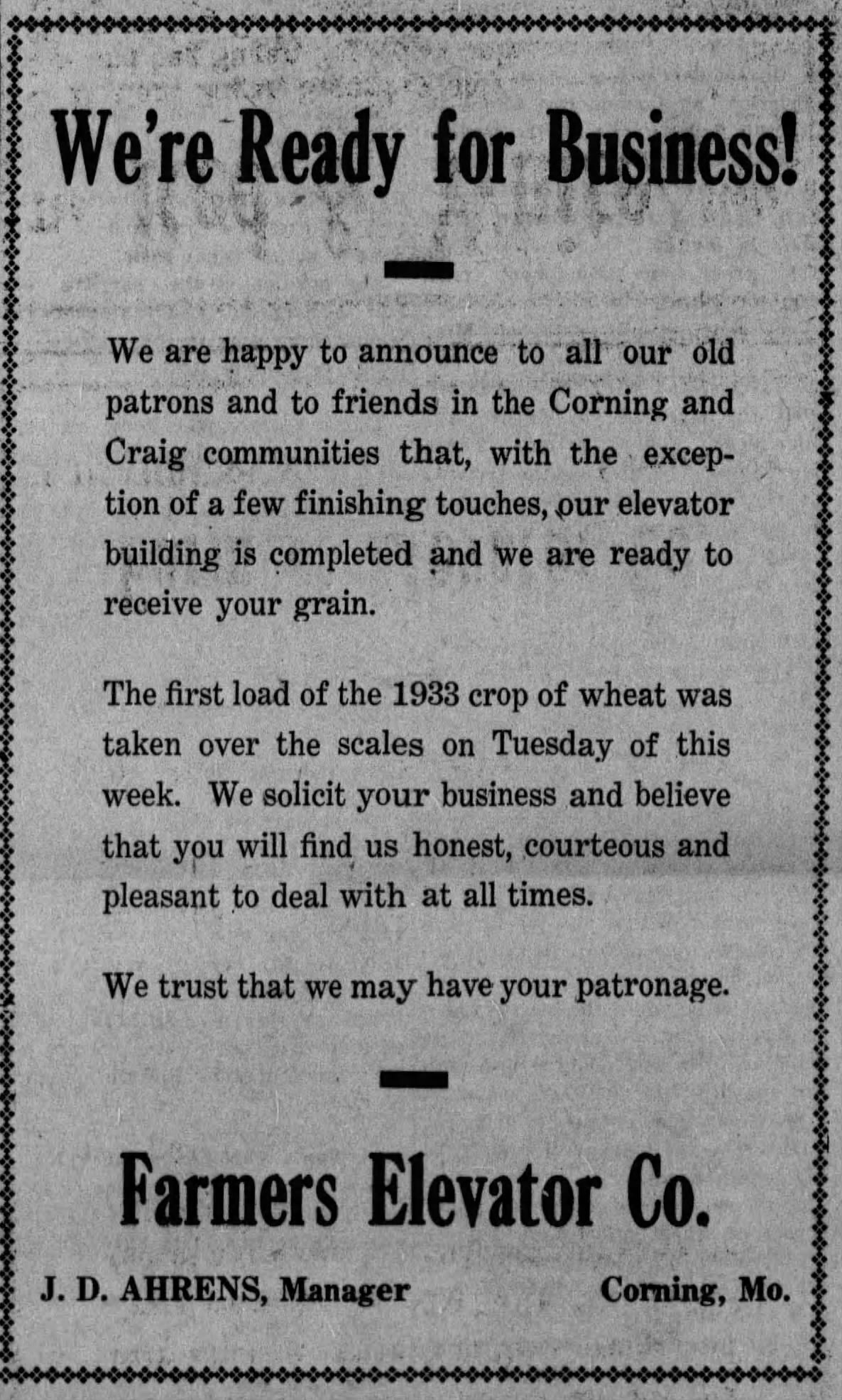 Only a few finishing touches remained to be completed when Farmers Elevator placed a July 14 ad in the Leader informing “all our old patrons and … friends in the Corning and Craig communities … we are ready to receive your grain.”