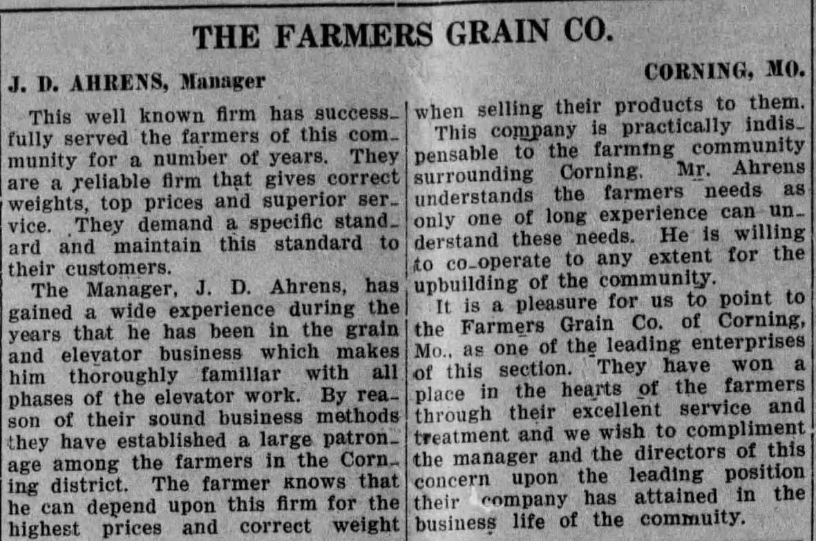 The elevator was “practically indispensable to the farming community surrounding Corning” and had even “won a place in the hearts of the farmers through their excellent service and treatment.”