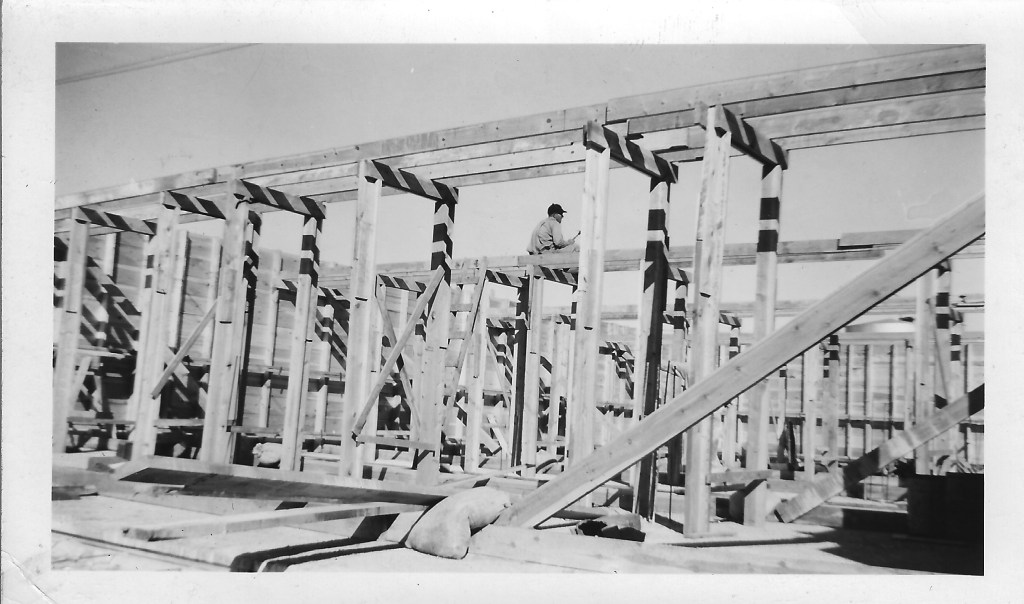 Concrete mixing machinery is already in place at the site, a tool and supply shed has been erected, and some of the forms are being built. Much of the gravel which will be needed has been hauled to the site also.