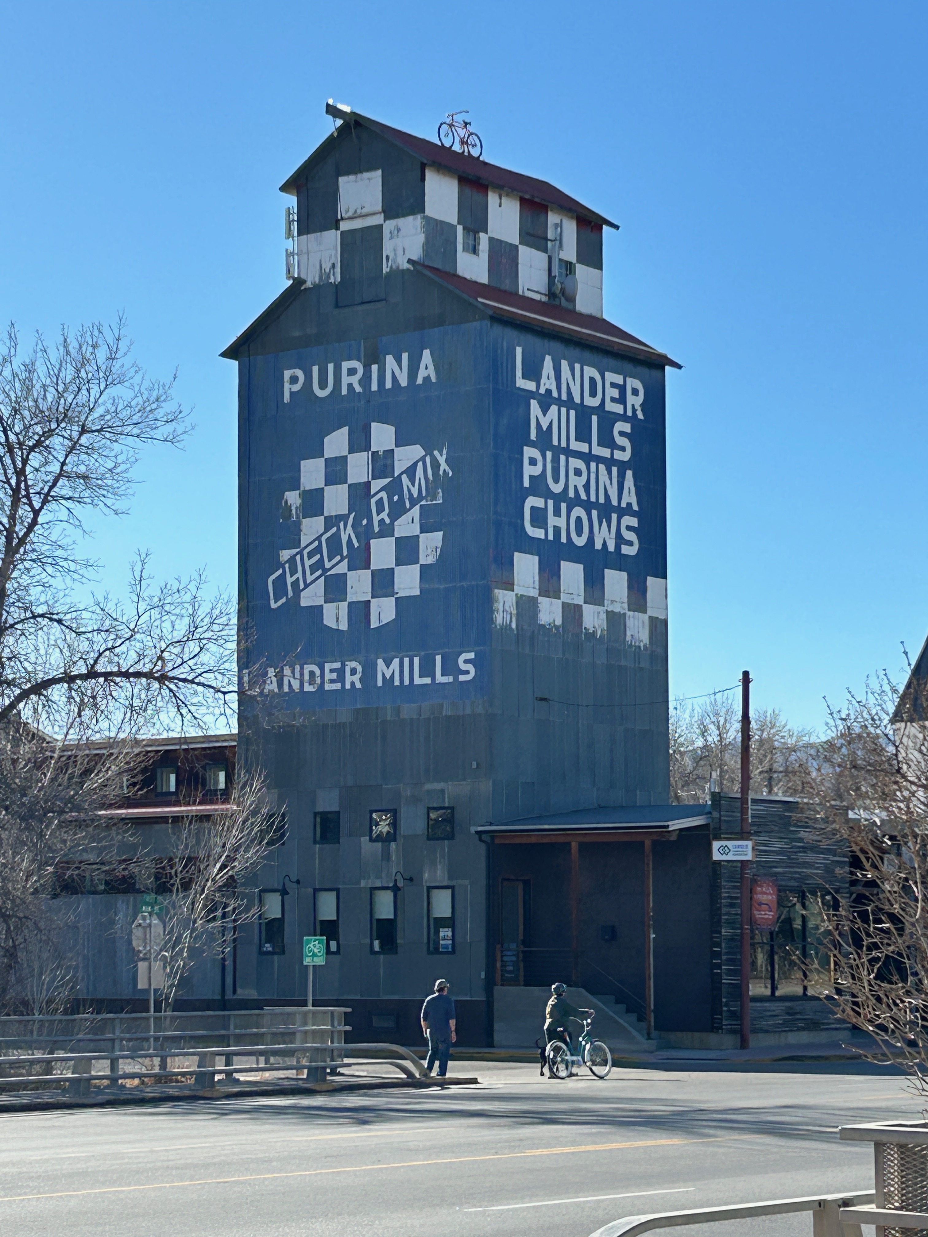 Artists who happened through Lander have also been inspired by the elevator, and you will find it with its Bike Mill and Purina checkerboard represented in paintings and drawings all over town. J. C. Dye, a local painter and sculptor, recently worked on a painting commission that featured the Lander elevator prominently, with a cattle drive running down the main street in its shadow. The painting will soon adorn a local concern.