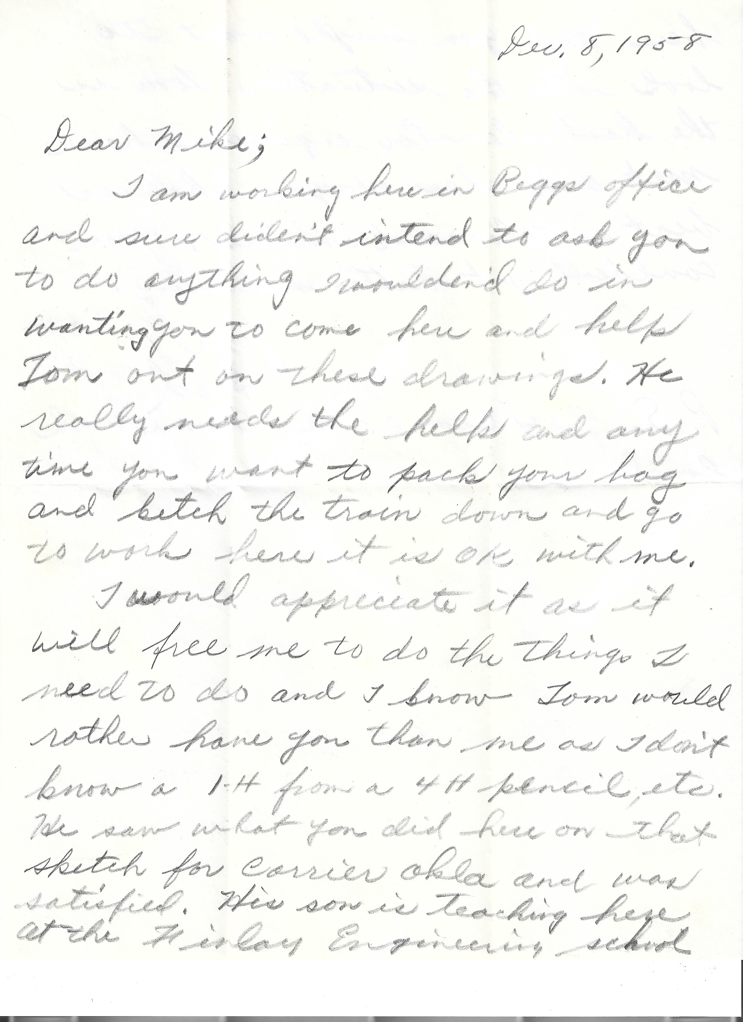 I am working here in Beggs office and sure didn’t intend to ask you to do anything I wouldend do in wanting you to come here and help Tom out on these drawings. He really needs the help and any time you want to pack your bag and ketch the train down and go to work here it is OK with me.