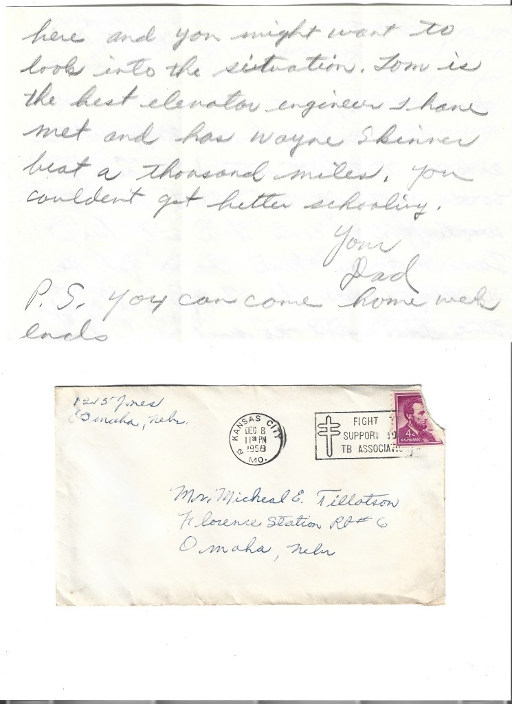According to my mother Mary Catherine, who was Mike’s older sister, he suffered a fractured shoulder and, in consequence, lost his wrestling scholarship at University of Nebraska. From fragmented sources, we piece together the rest of his story. In 1959 and 1960, Mike served in the army. He then returned to Lincoln and attained a bachelor’s degree in education. No career as a schoolteacher or coach followed. Nor a career at Tillotson Construction Co.–it went out of business after Reginald’s death in 1960.