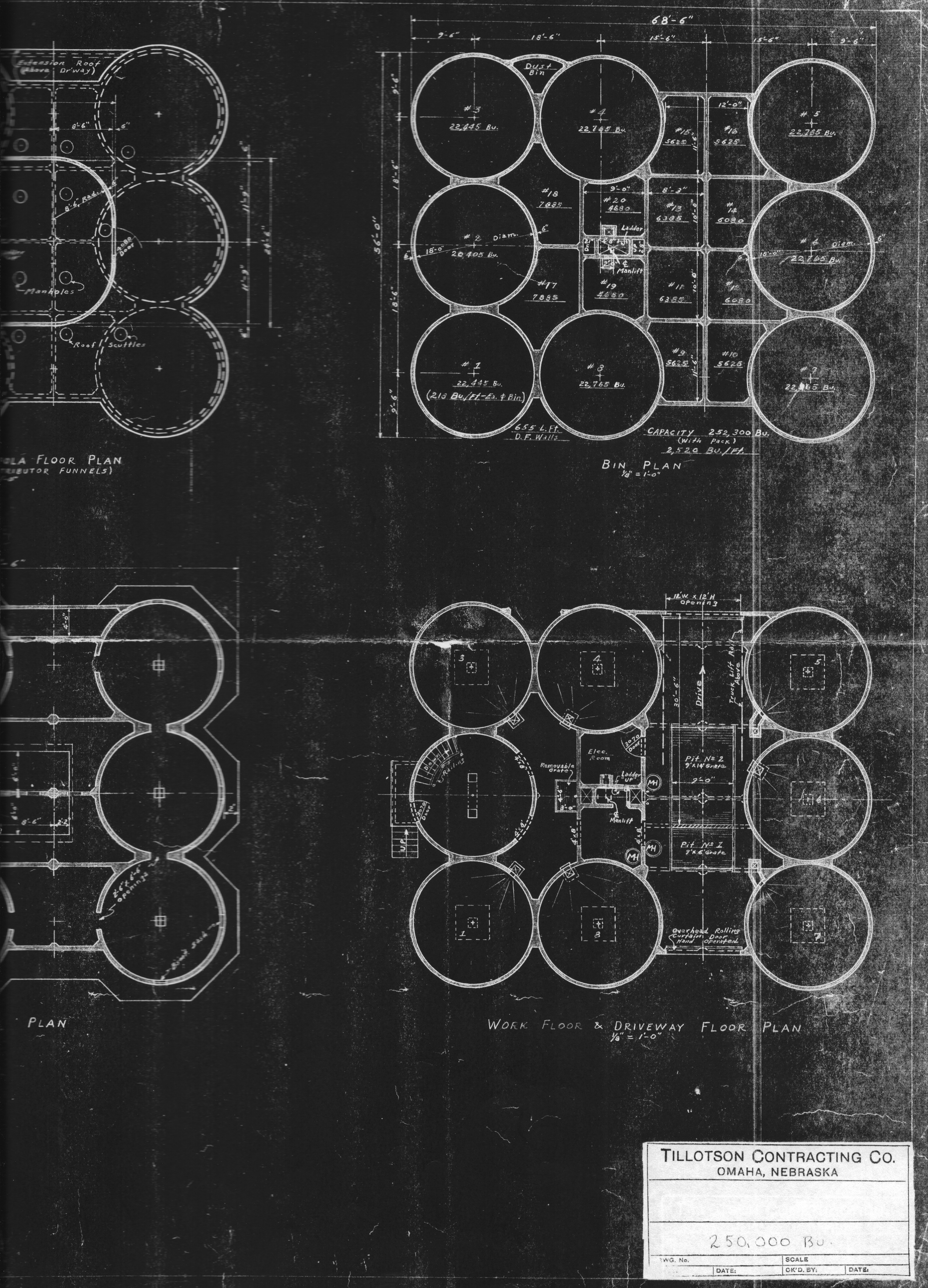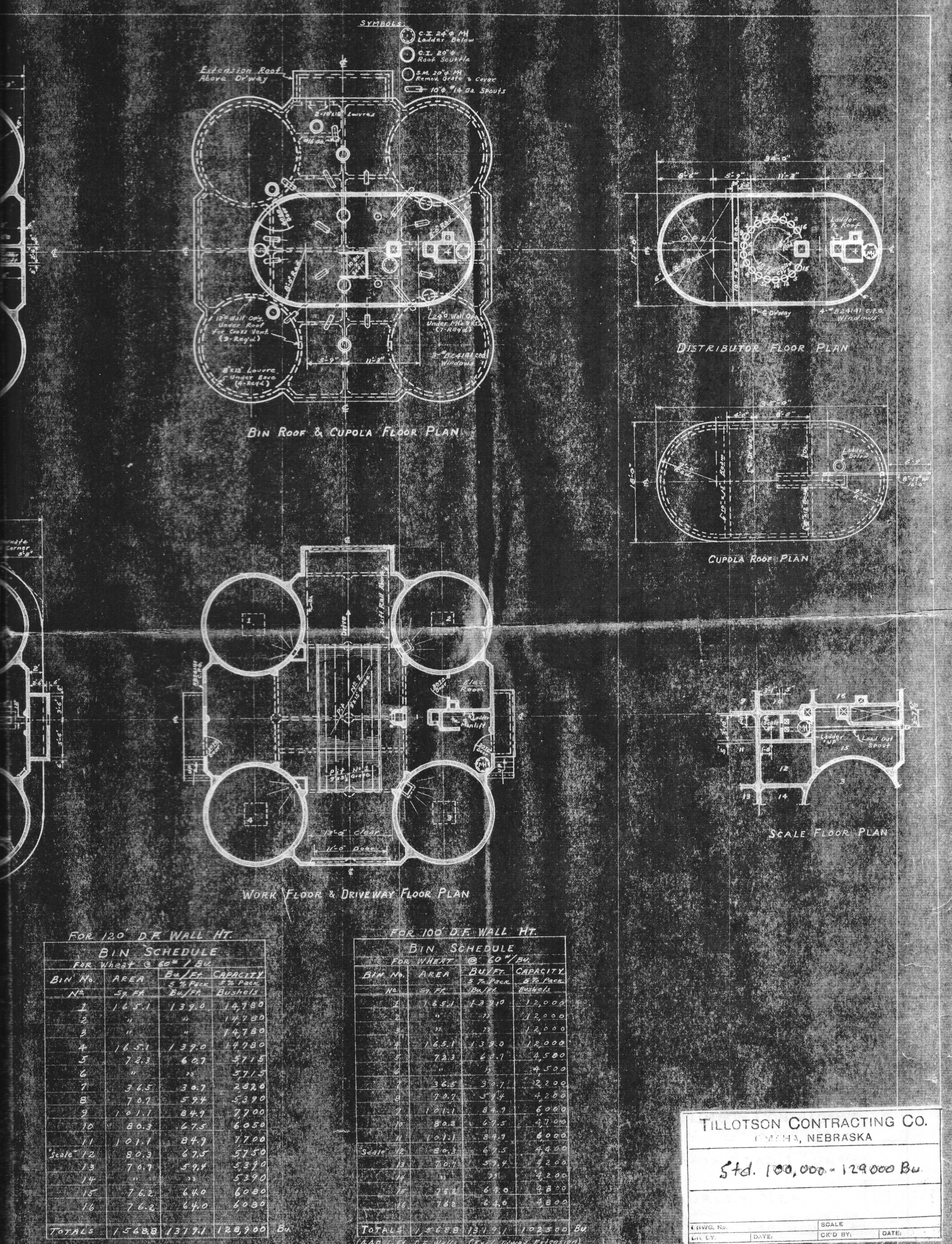 Here in sharp detail, at the scale of one-eighth-inch to one foot, we have drawings for a 250,000-bushel Tillotson elevator. The bin plan gives capacity at 252,300. Tillotson Construction Co. built many elevators of this capacity, although we can’t determine how many of them adhered to the drawings we see here.