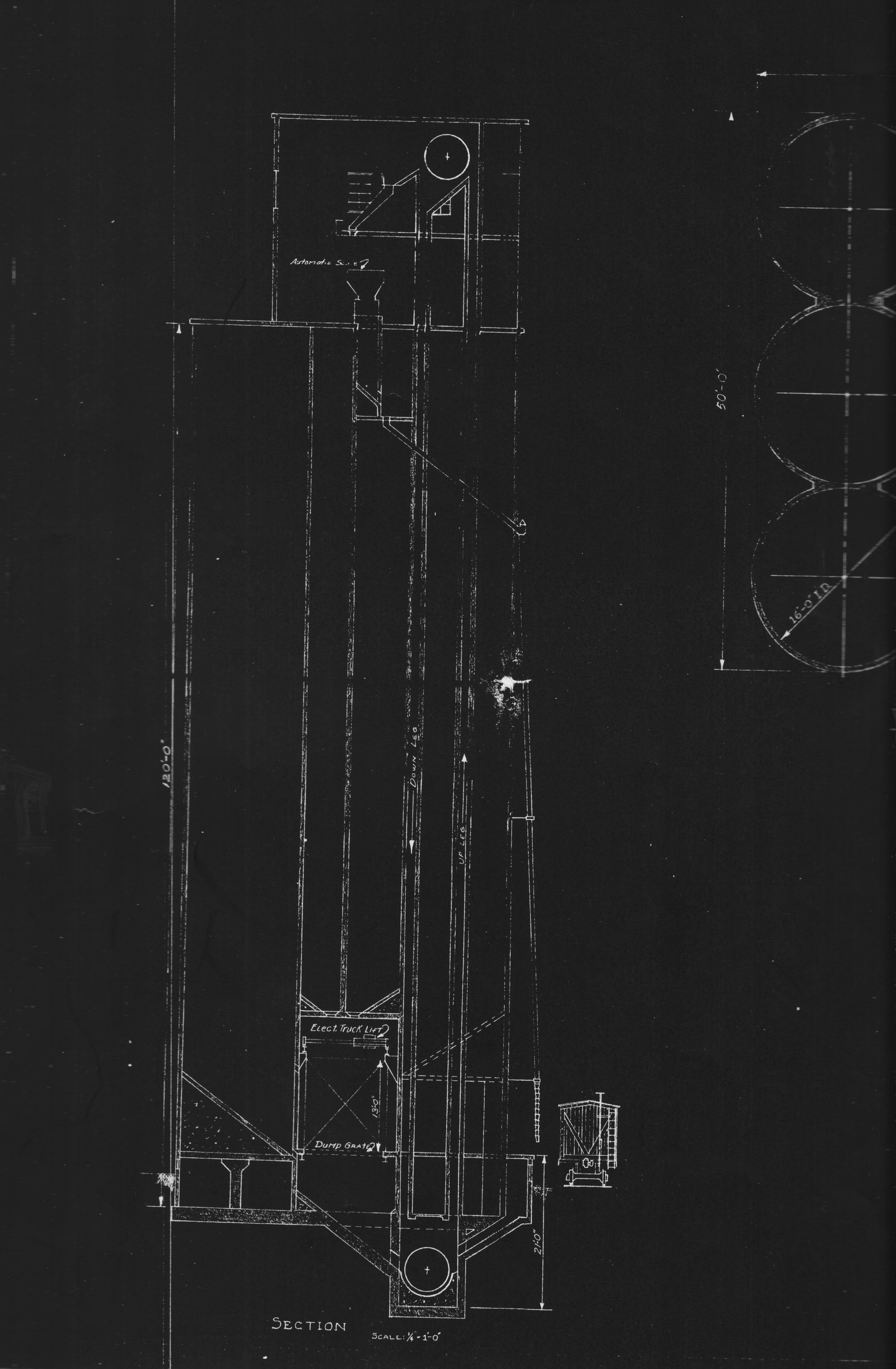 Number 21, which can barely be seen in the Bin Plan, is an ovalized chute that stands just outside the accommodations for the electrically operated man lift. “Down” is inscribed to the left of the lift, and “loader” and “up” are to the right.