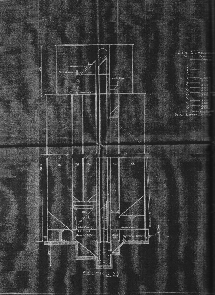 The stairway inside Number Eight is indicated with the note “Down to Bsm’t.” And this stairway is the reason for the tank’s capacity of 15,495 bushels as opposed to the 16,880 bushels of the others.