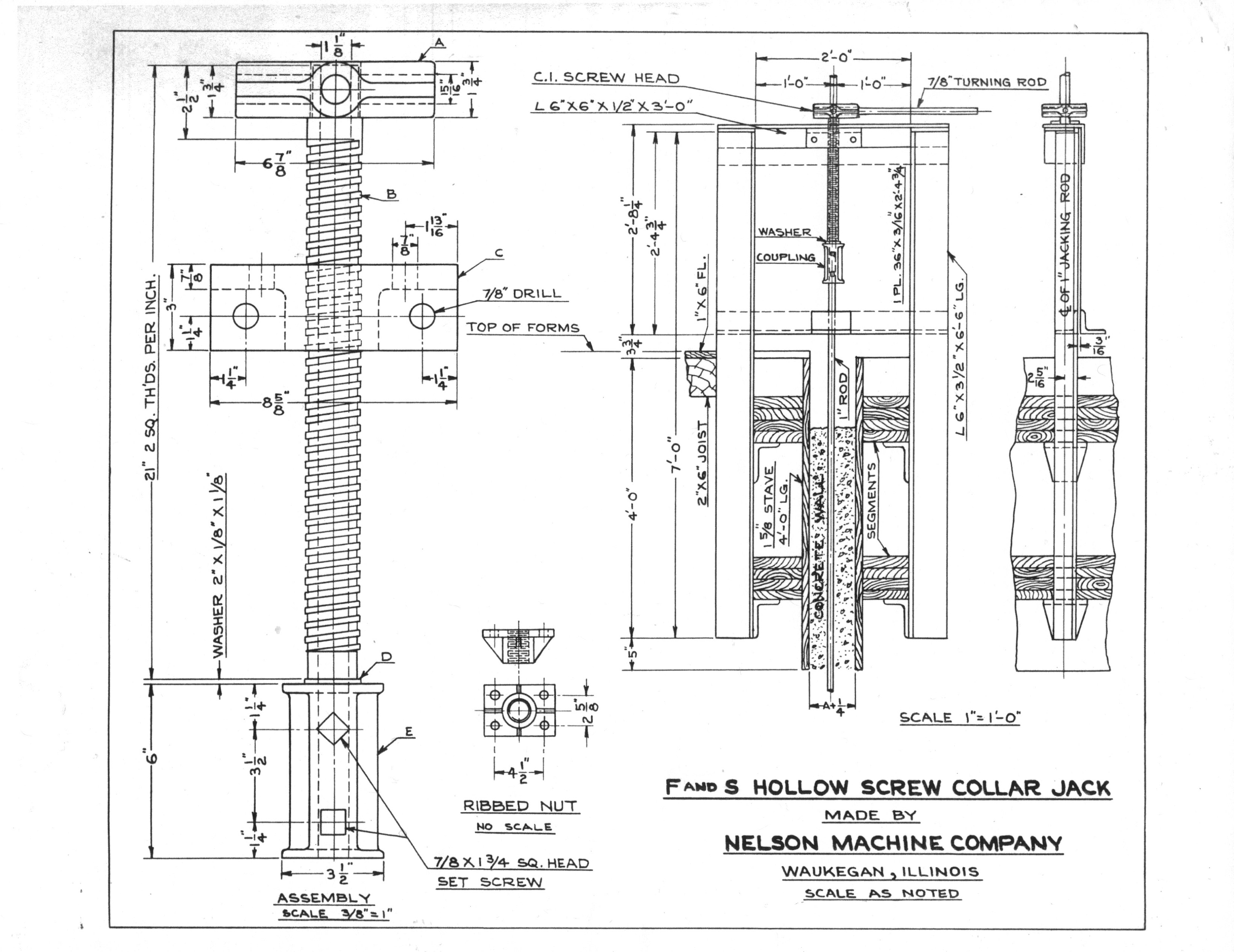 To the left above, seen at the scale of one-quarter inch to one foot, is the cross-section of the structure. The main house has five tanks (silos) with internal diameter of 16.0 feet and achieves a height of 120 feet. No dimensions are shown for the cupola; the only notation in the plan says “automatic scale.”