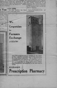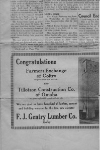 One of the largest wheat crops ever yielded by this section of the northwestern Oklahoma wheat belt was dumped into Goltry’s new 60,000 bushel elevator built for the Farmers’ Exchange of Goltry by the Tillotson construction company of Omaha, Nebraska,