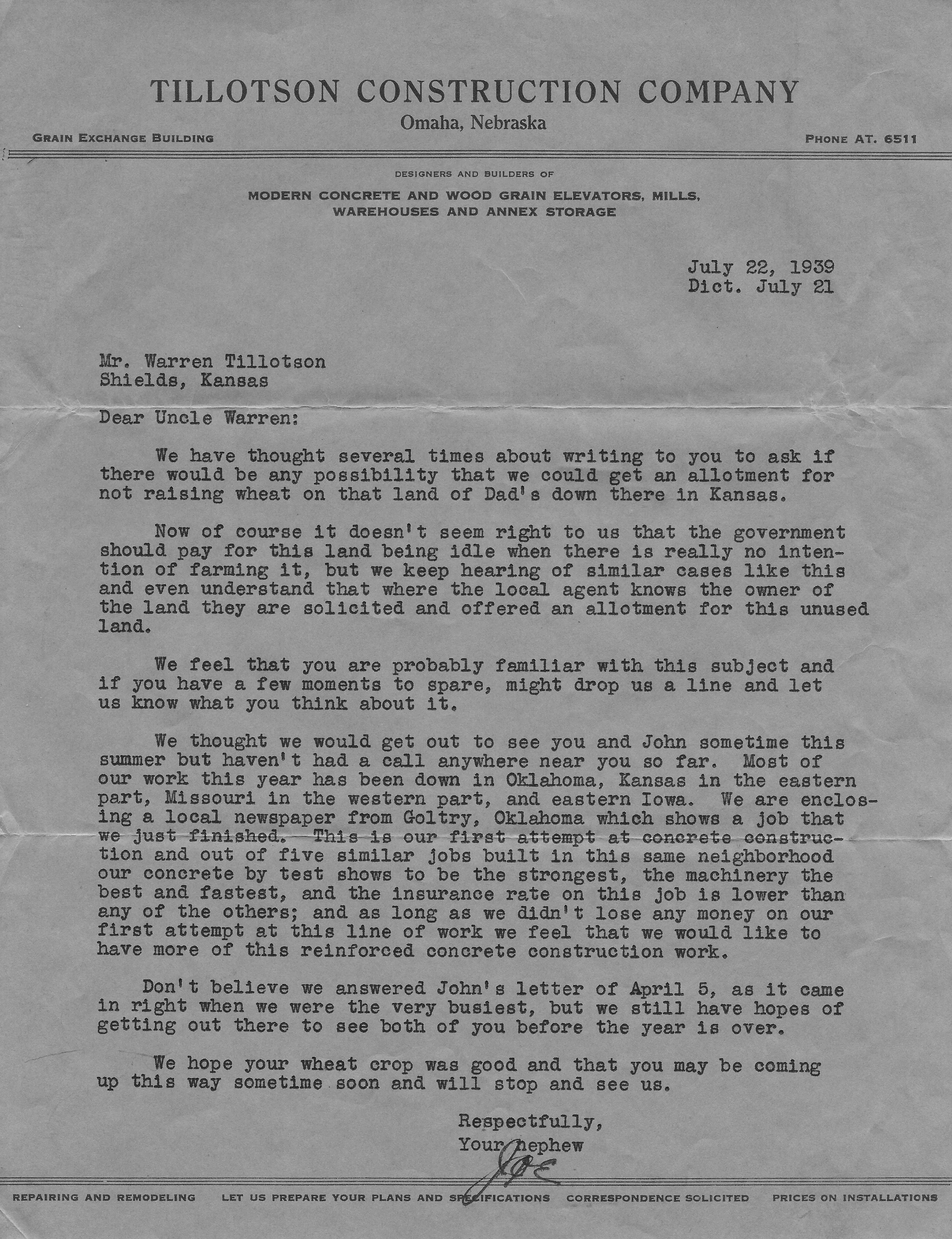 We have thought several times about writing to you to ask if there would be any possibility that we could get an allotment for not raising wheat on that land of Dad’s down there in Kansas.