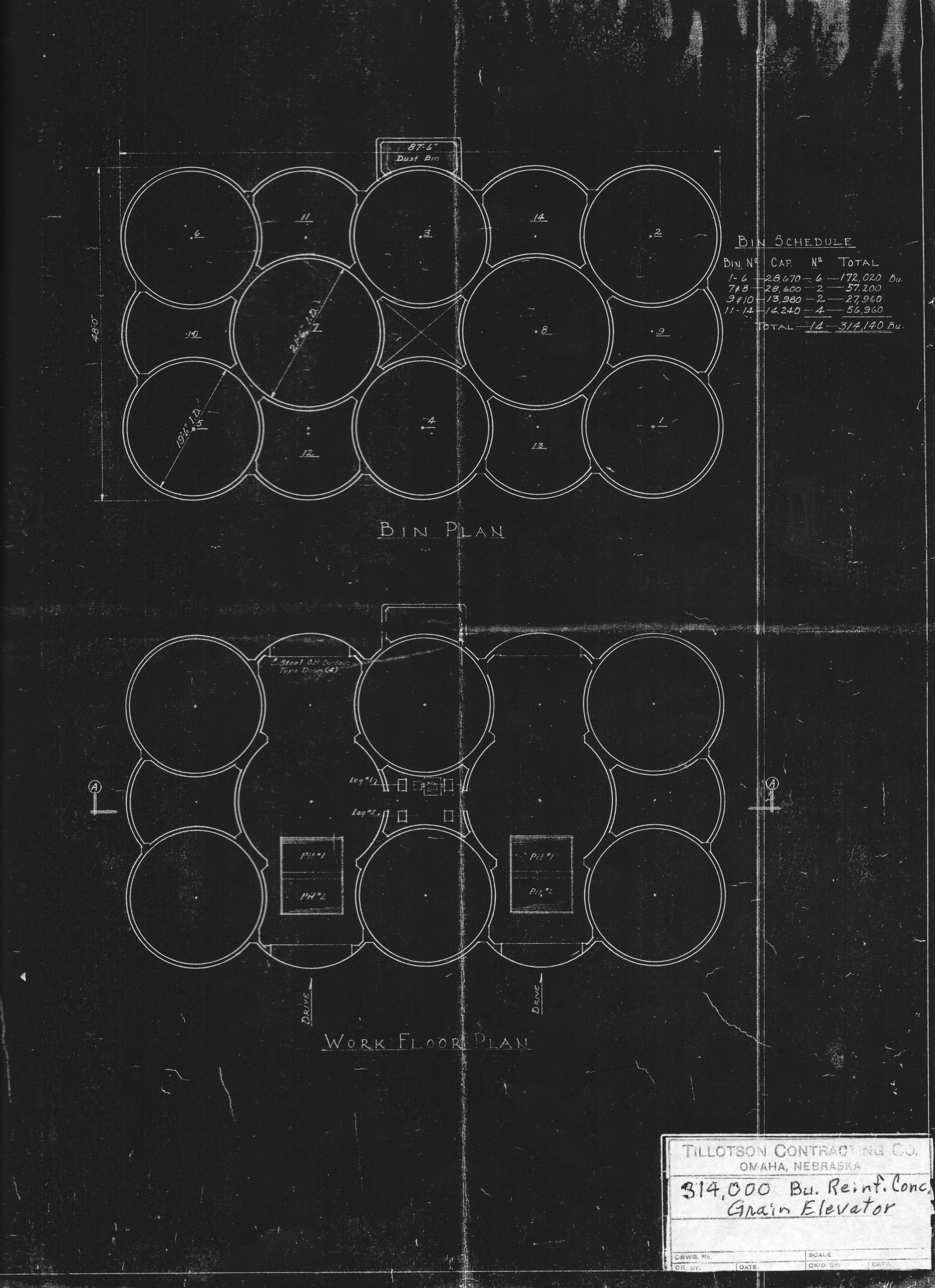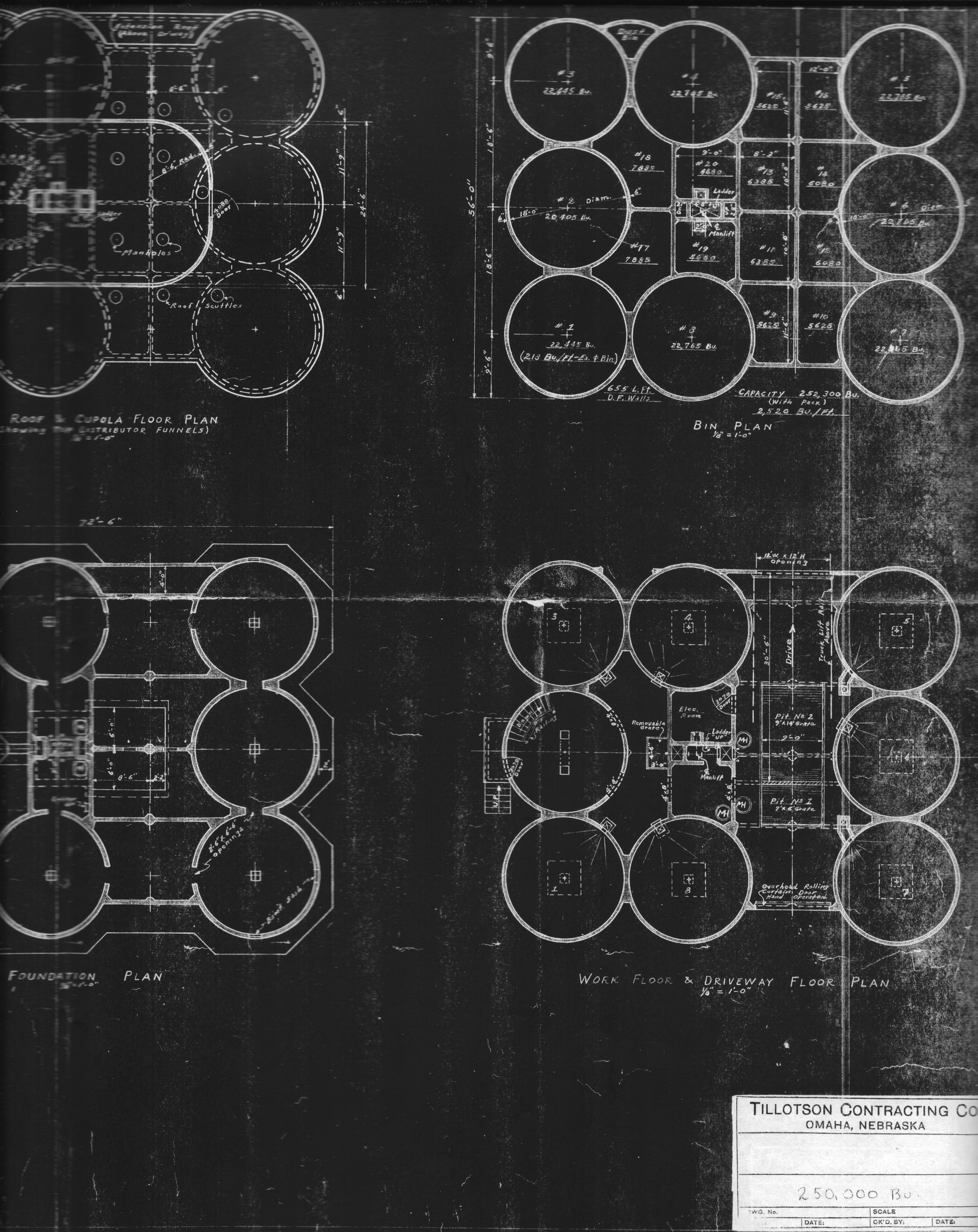 The drawings seen above are Tillotson’s standard plan for a 250,000-bushel elevator with eight tanks (silos).
