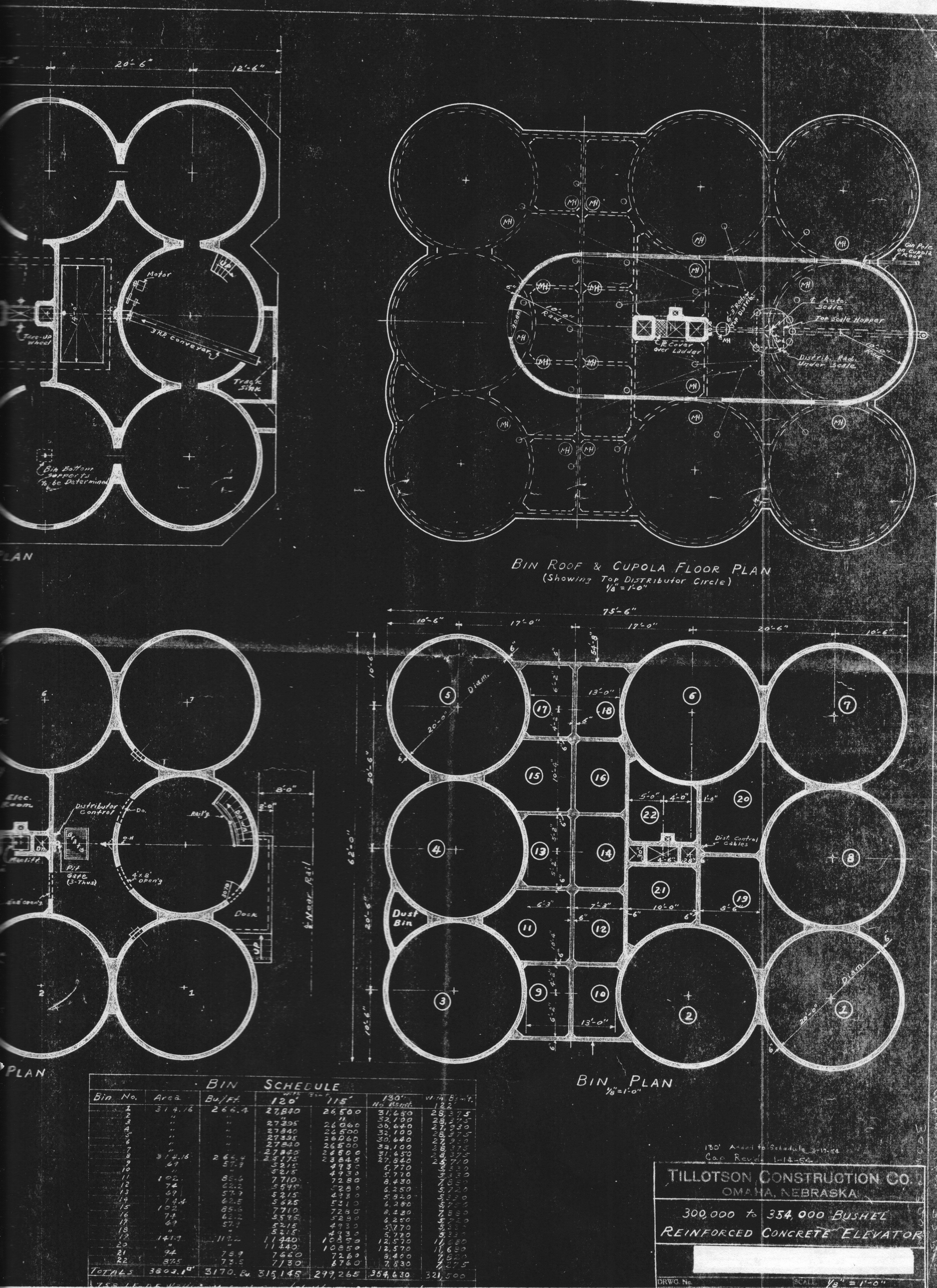 1954: Orienta, Okla. (original plan) 312,000 bushels with 10 tanks of 20 feet in diameter towering 114 feet nine inches; Bellwood, Neb. (original plan) 340,000 bushels with 10 tanks of 20 feet in diameter and 130 feet in height; Iowa Falls, Iowa (Bellwood plan) 321,000 bushels of 122 feet (no other information is included in the records); Glidden, Iowa annex of 331,000 bushels (incomplete entry); Ensign, Kan. annex (original plan) 319,830 bushels with 11 tanks of 19 feet in diameter and 118 feet in height.