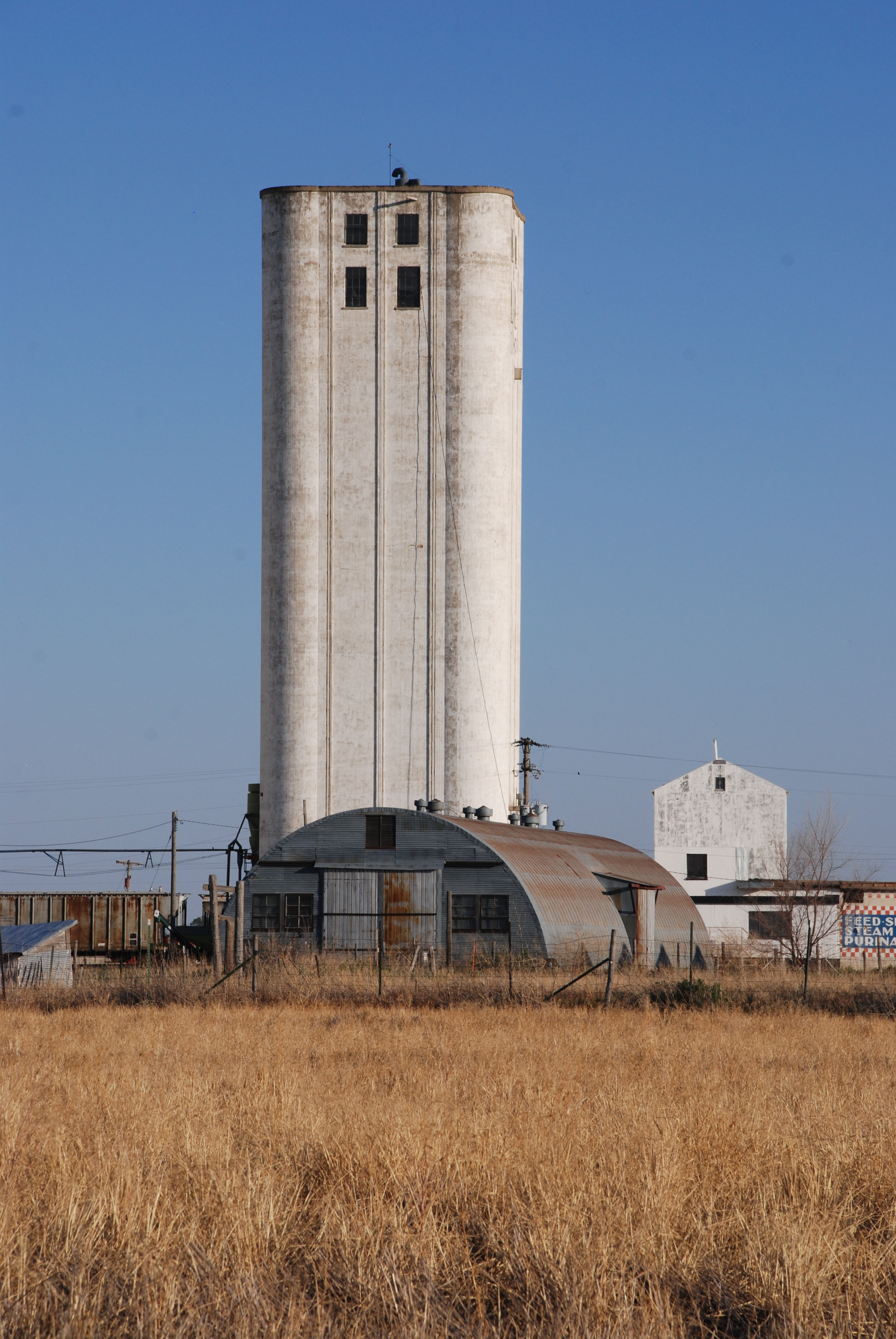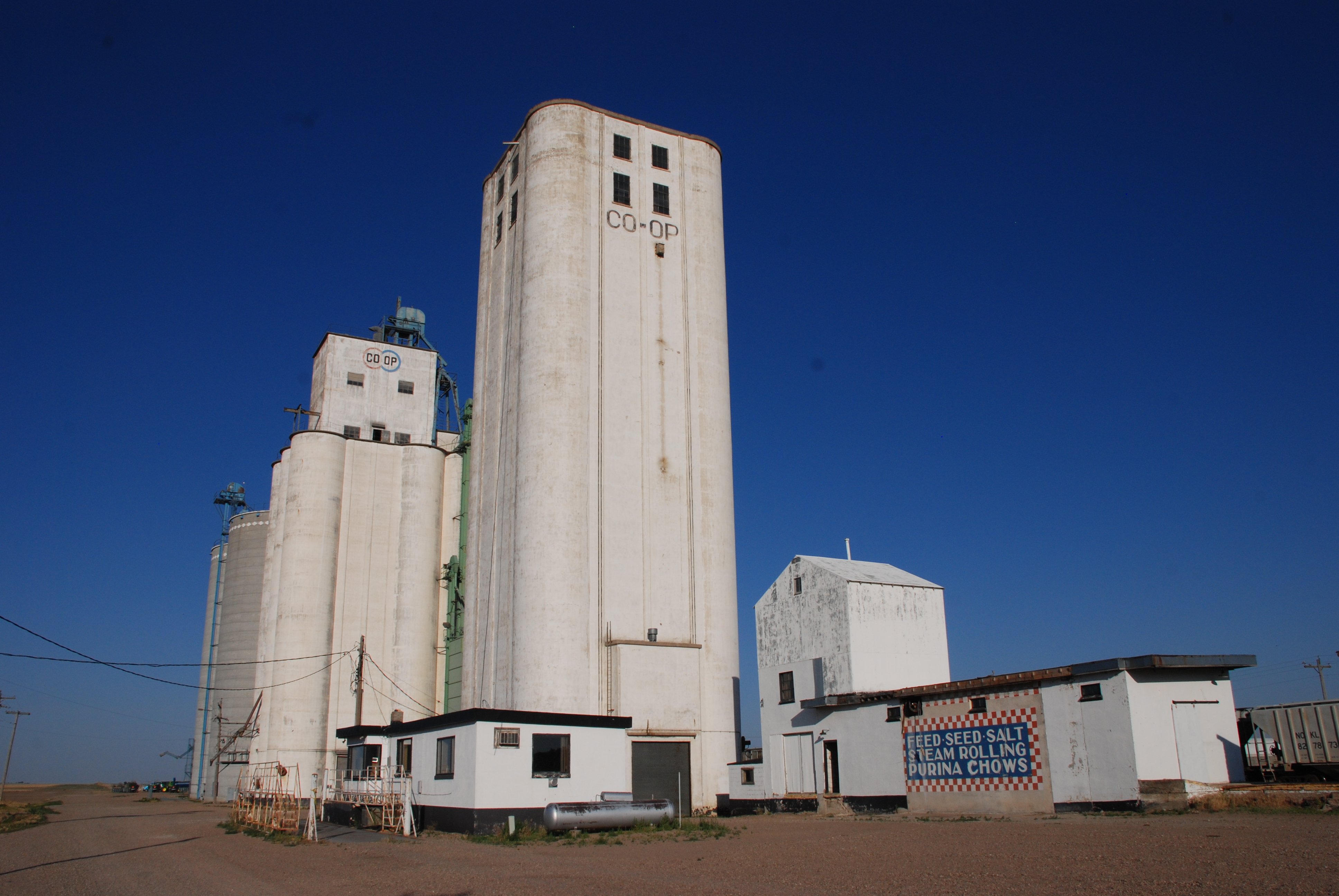Dike’s concrete elevator was built in 1946, and it came with an unusual (for Tillotson) headhouse. In the one place where we found a similar example, at St. Francis, Kan., the elevator built by J. H. Tillotson, Contractor, sported a rectilinear headhouse. Though it was replaced much later, early pictures show that the St. Francis headhouse was built in that style.