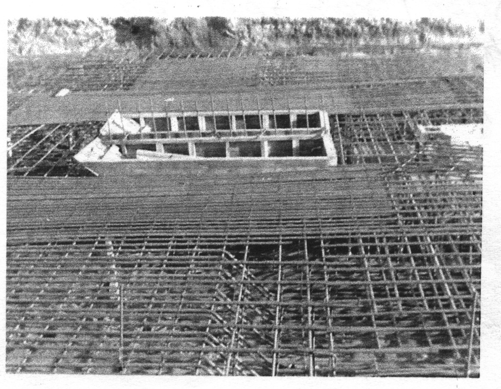 Marvin: There were two levels of rebar, a bottom level and they put up on blocks, I remember maybe eight, or 10, 12 inches off the base, and they laid a mat down, a rebar mat, and then they built another one above that, about three foot above it. So there was two mats of rebar put in there, and it’s all fastened together and welded together. You can see in those pictures, there was an electric welder setting out in the middle there, that they welded a lof that rebar together with.