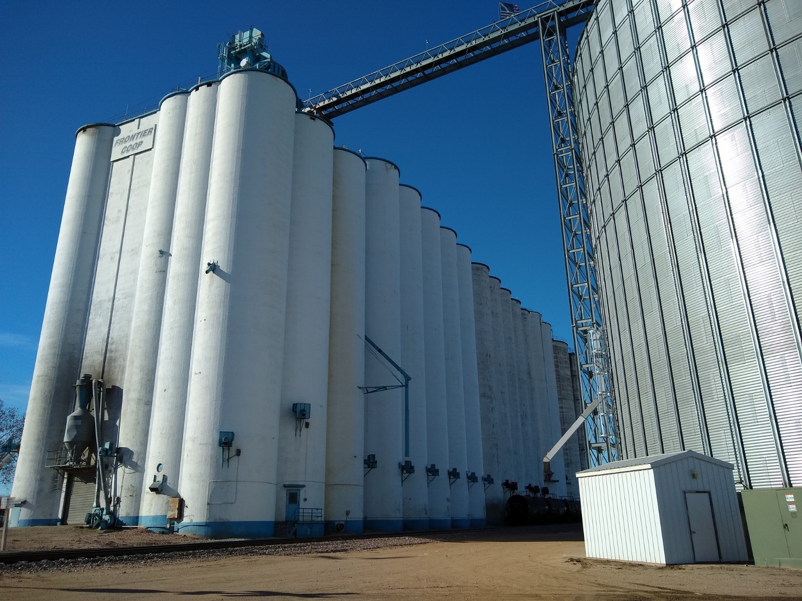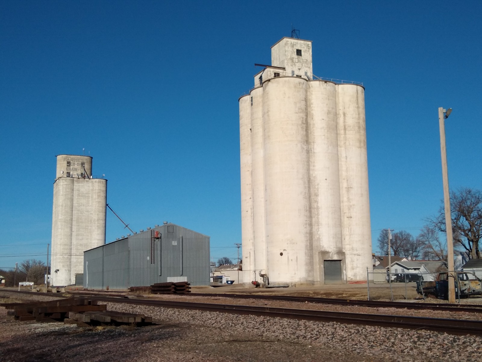 Both headhouses are labeled “Farmers Co-Op Grain Co.” An explanation is given on Frontier’s website: “Over the years, the predecessors of both Frontier and Midwest (Cooperative) completed many mergers and acquisitions, growing their territories across southern and central Nebraska. The Frontier name came into being in 1990, following the merger of Farmers Cooperative Co. of Brainard with Farmers Union Cooperative of Mead.”